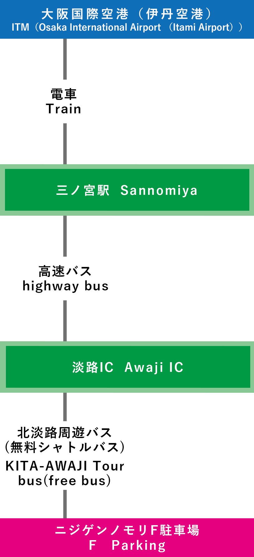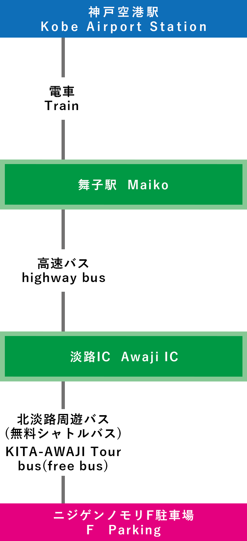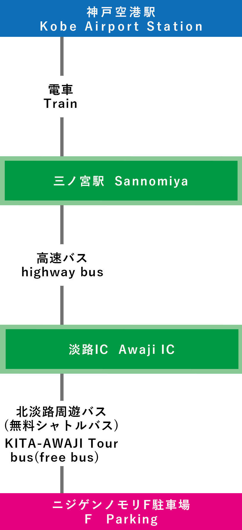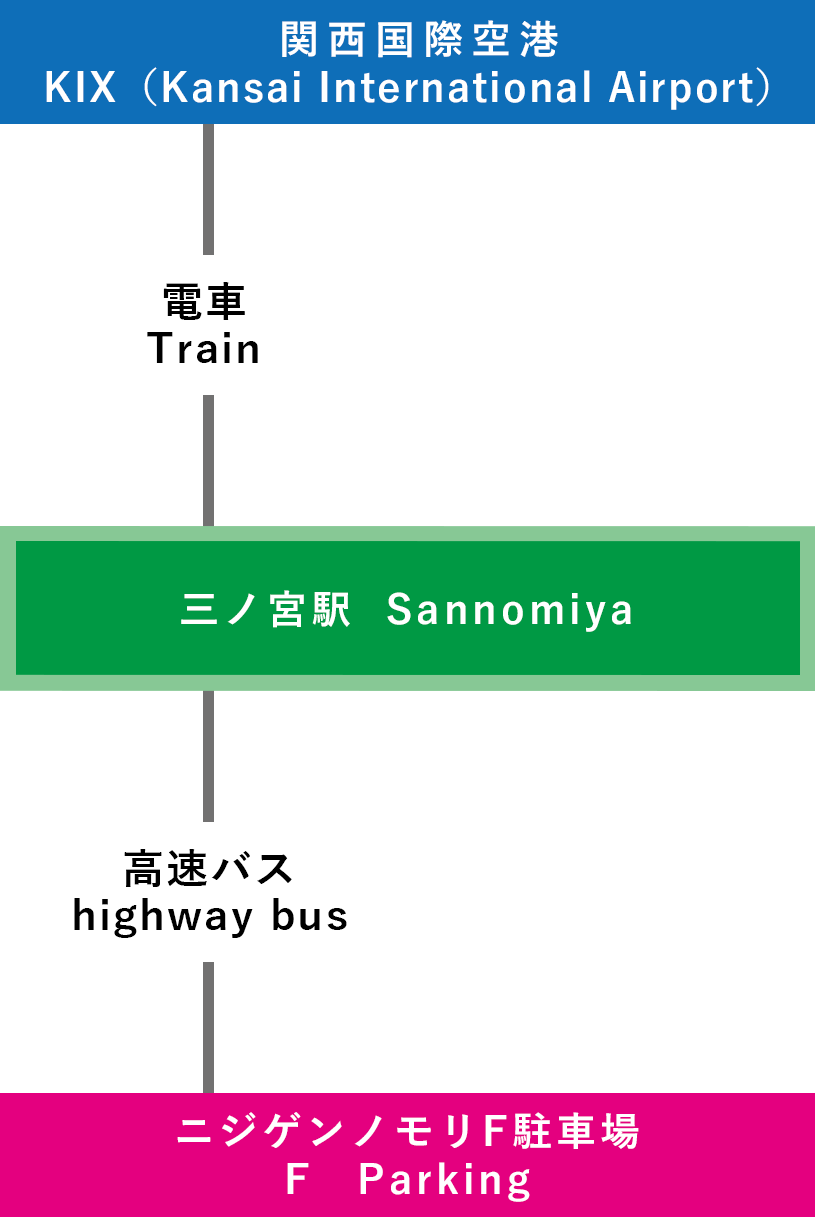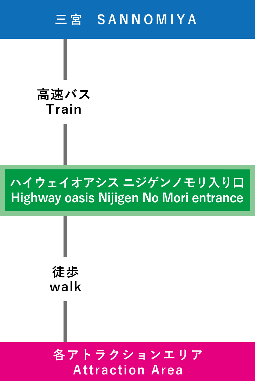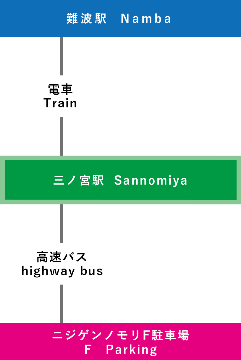 | 電車での行き方 【三宮(神戸)で乗り換え】 ⑦関西国際空港-三宮-淡路IC-ニジゲンノモリ(3時間15分~) |