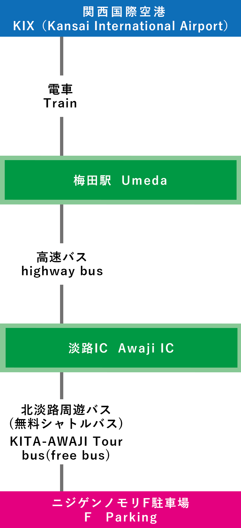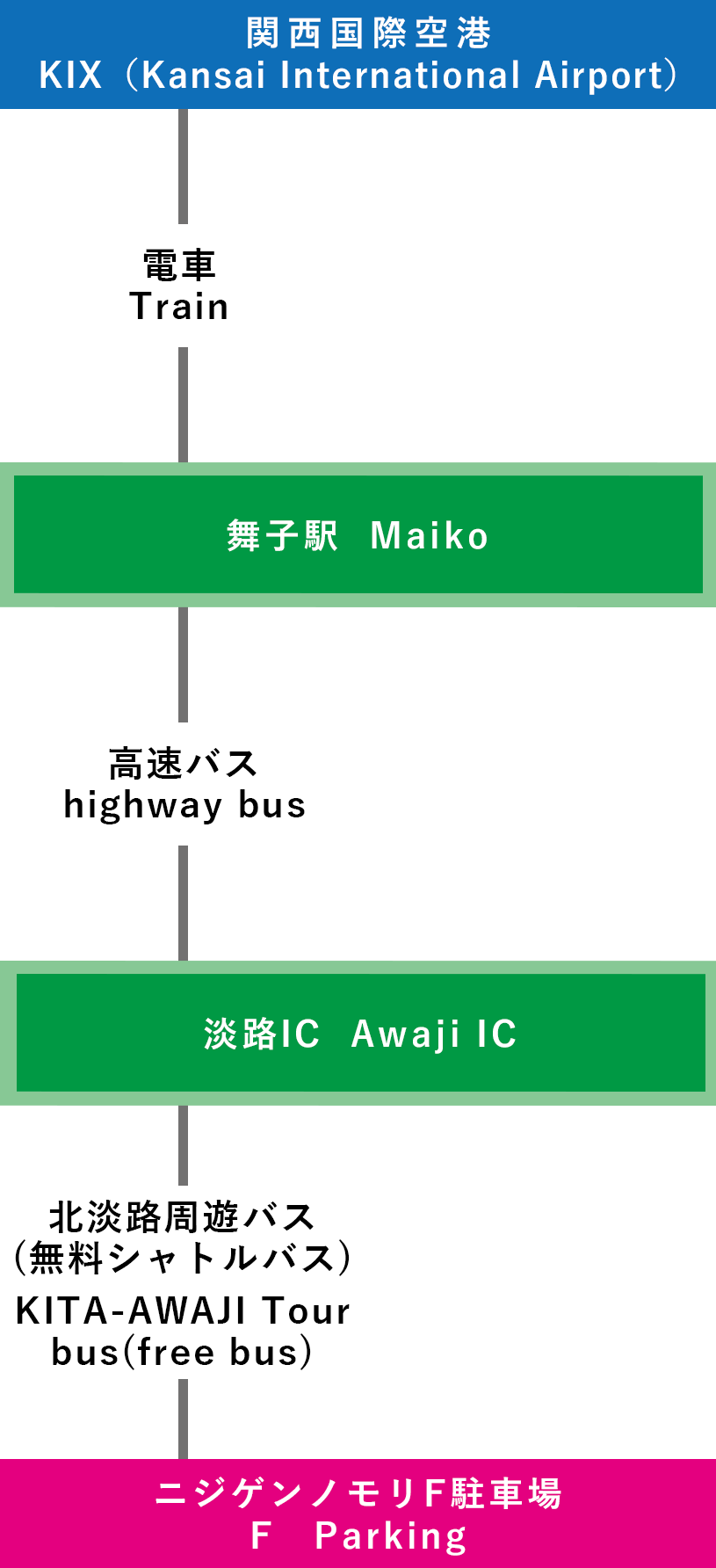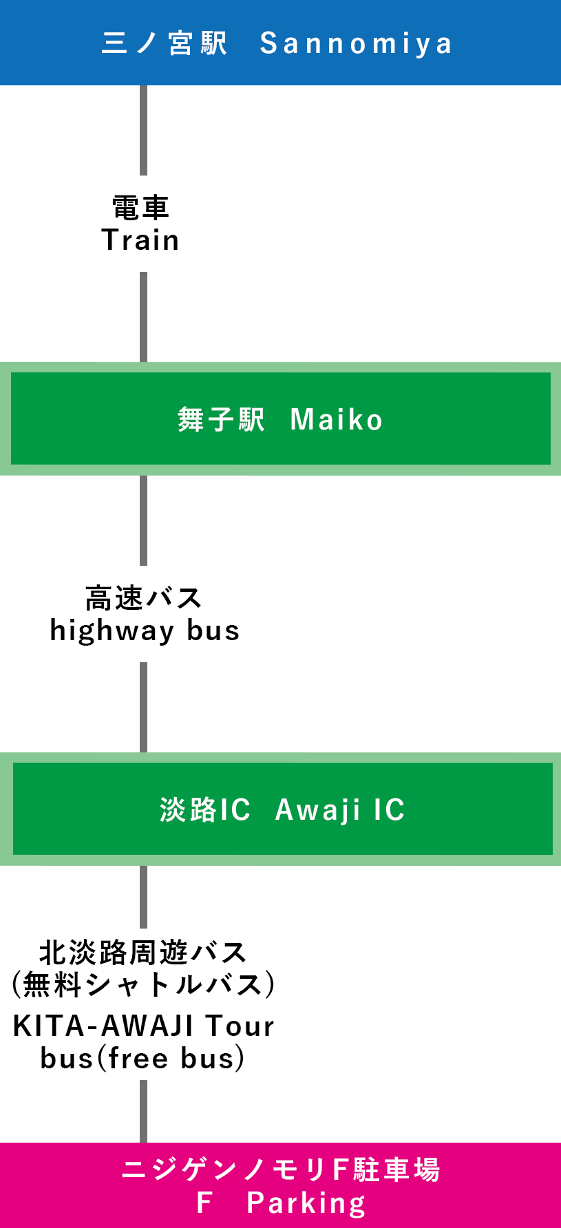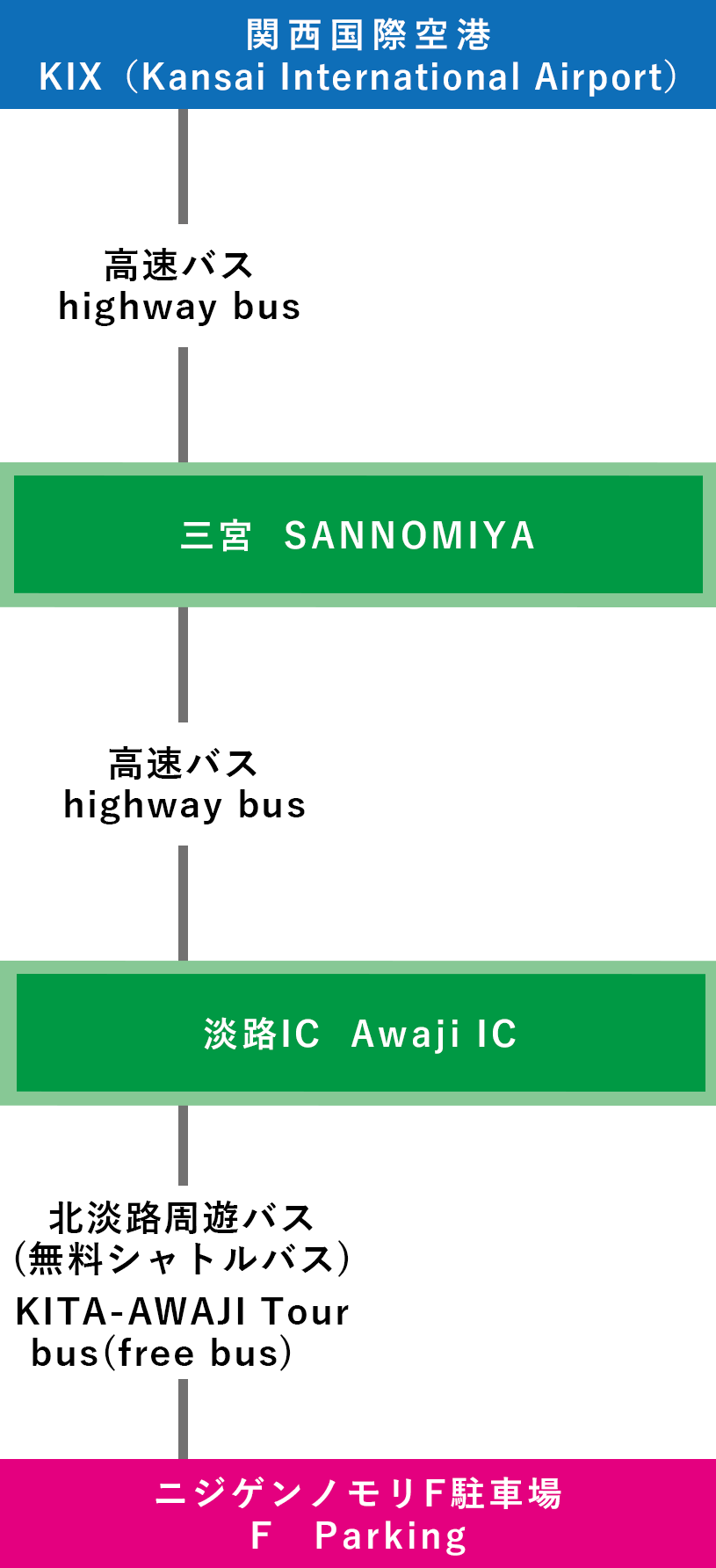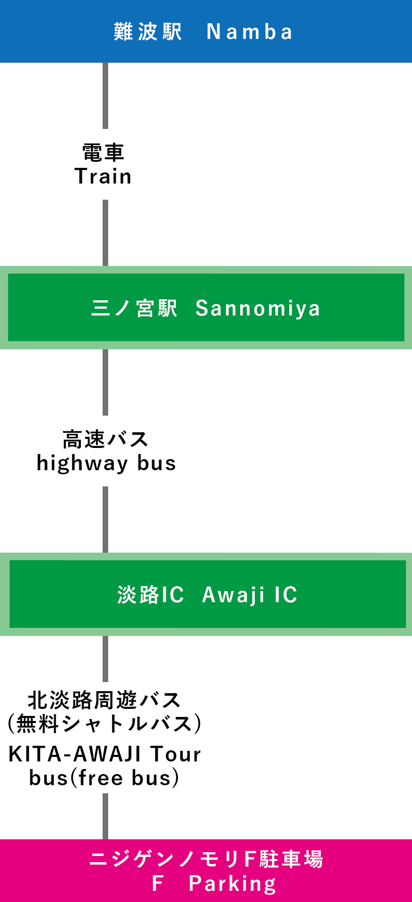 | 電車での行き方 【三宮(神戸)で乗り換え】 ⑦関西国際空港-三宮-淡路IC-ニジゲンノモリ(3時間15分~) |