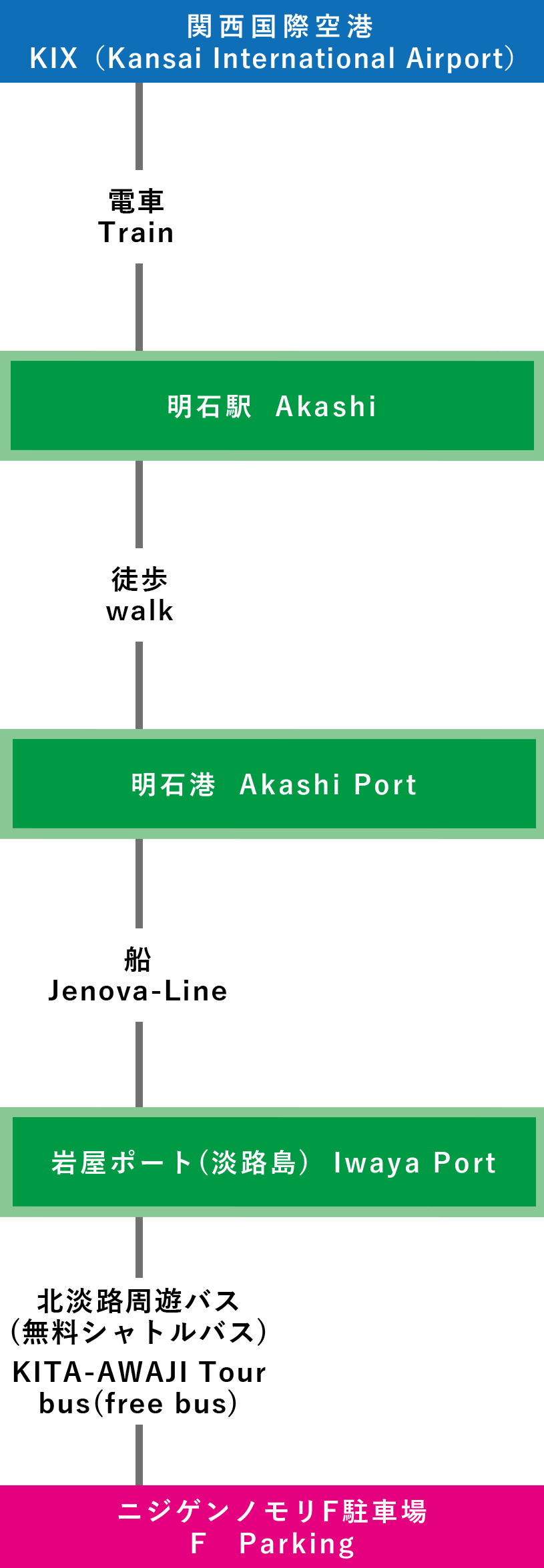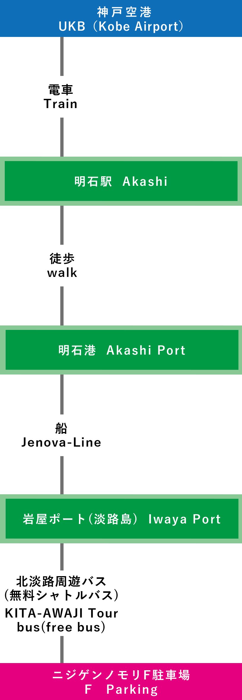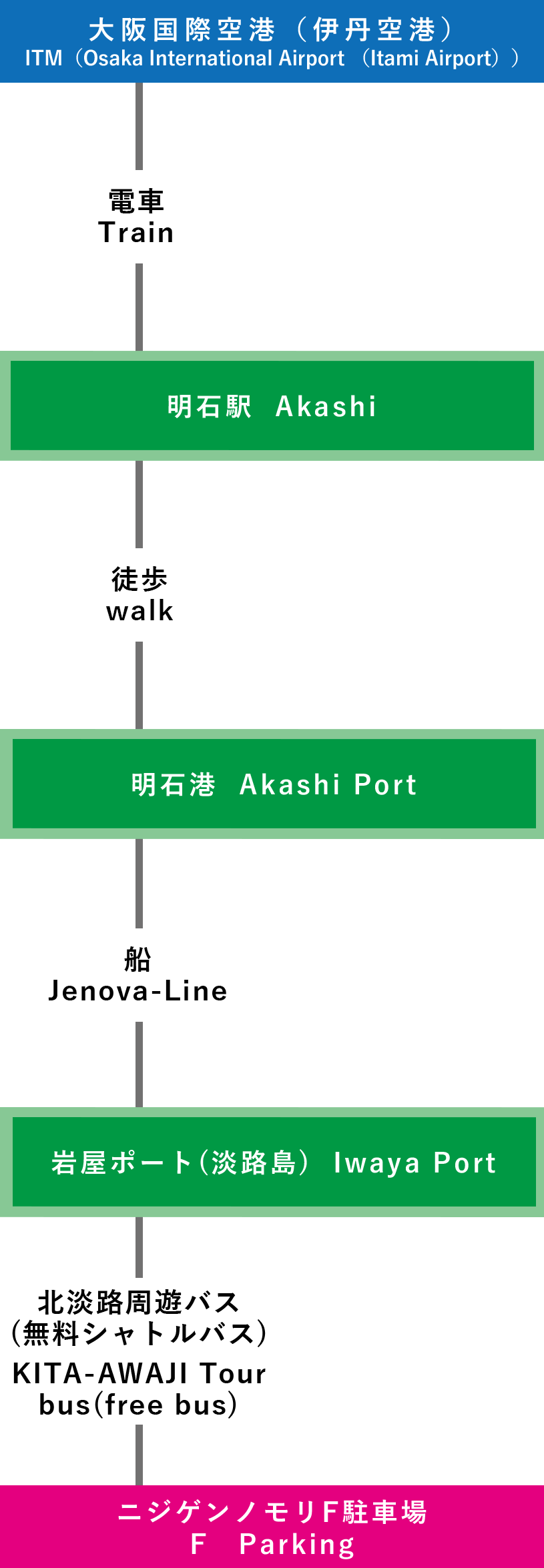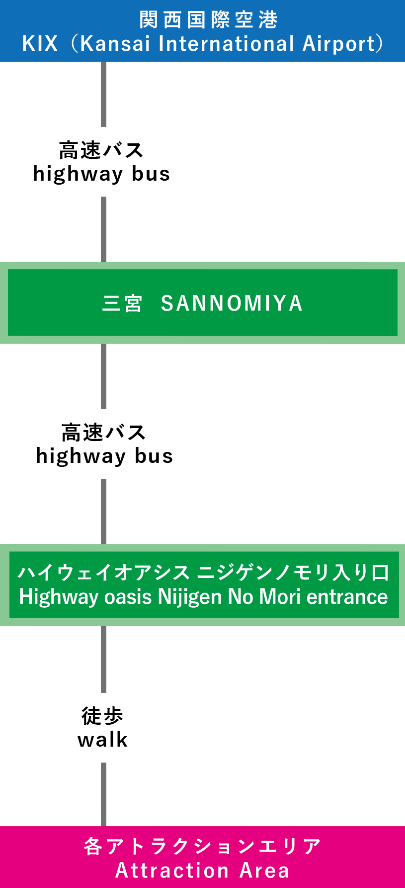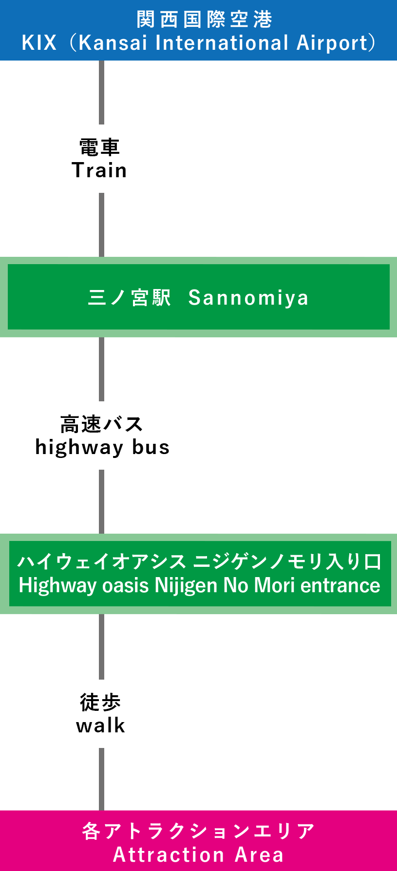 | 電車での行き方 【三宮(神戸)で乗り換え】 ⑦関西国際空港-三宮-淡路IC-ニジゲンノモリ(3時間15分~) |