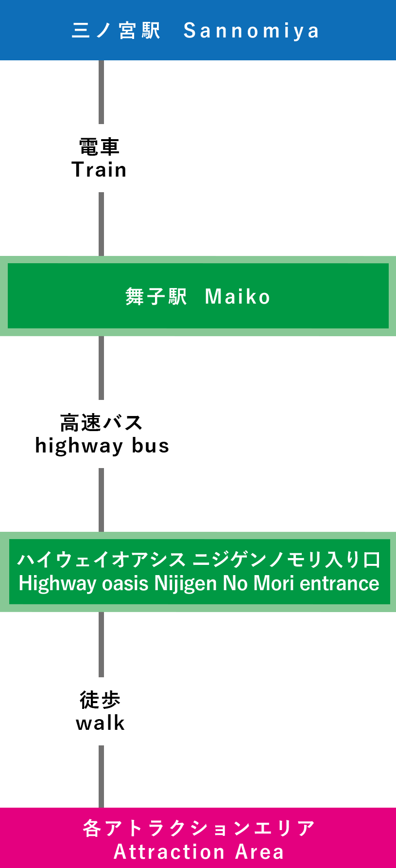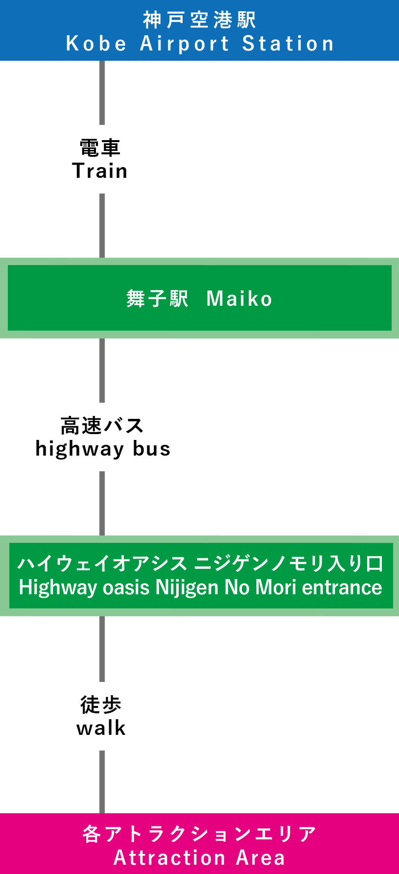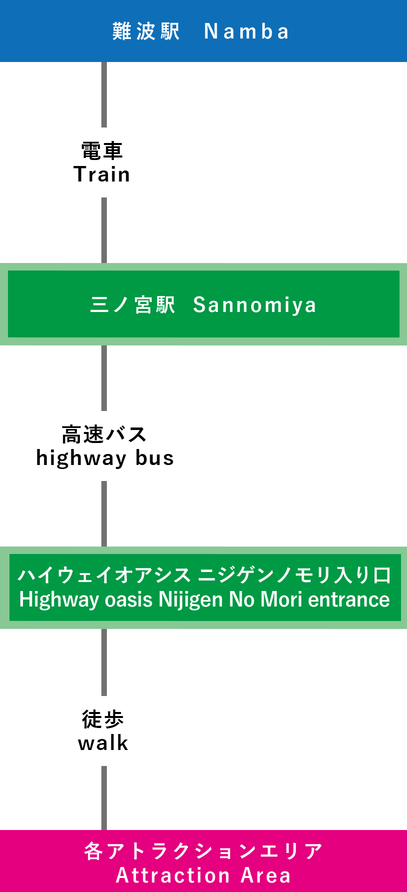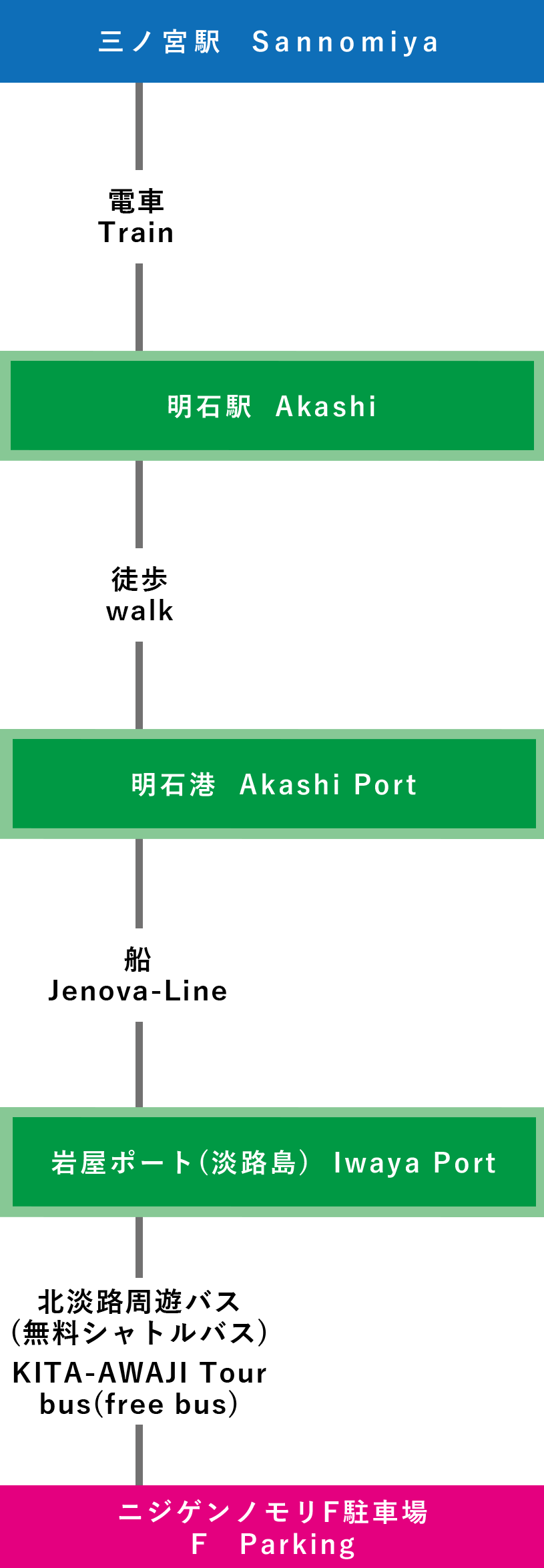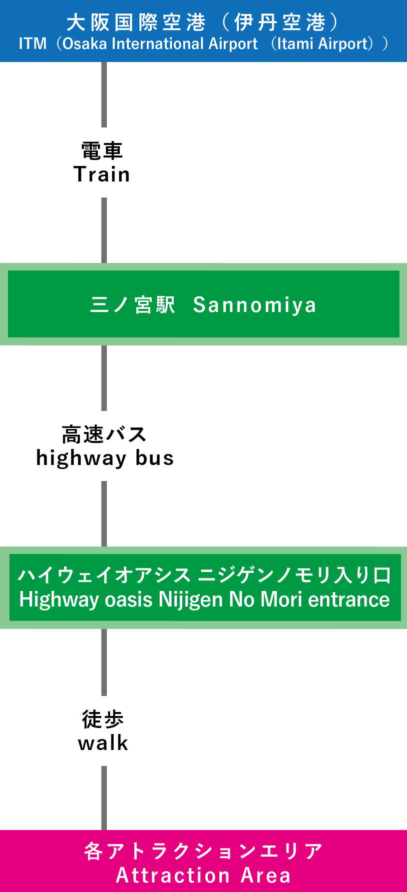 | 電車での行き方 【三宮(神戸)で乗り換え】 ⑦関西国際空港-三宮-淡路IC-ニジゲンノモリ(3時間15分~) |
