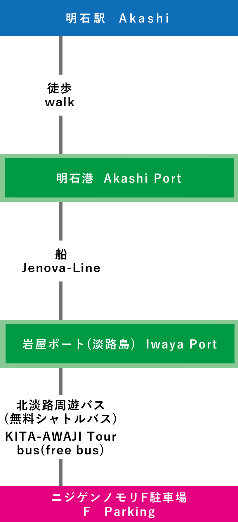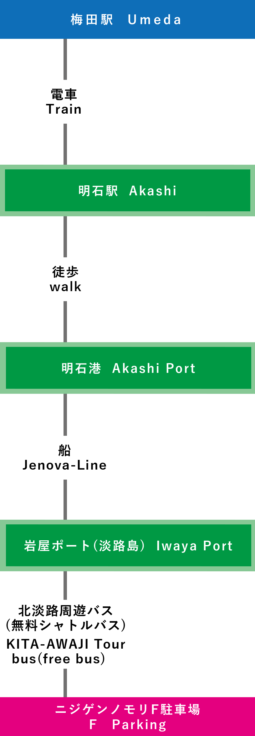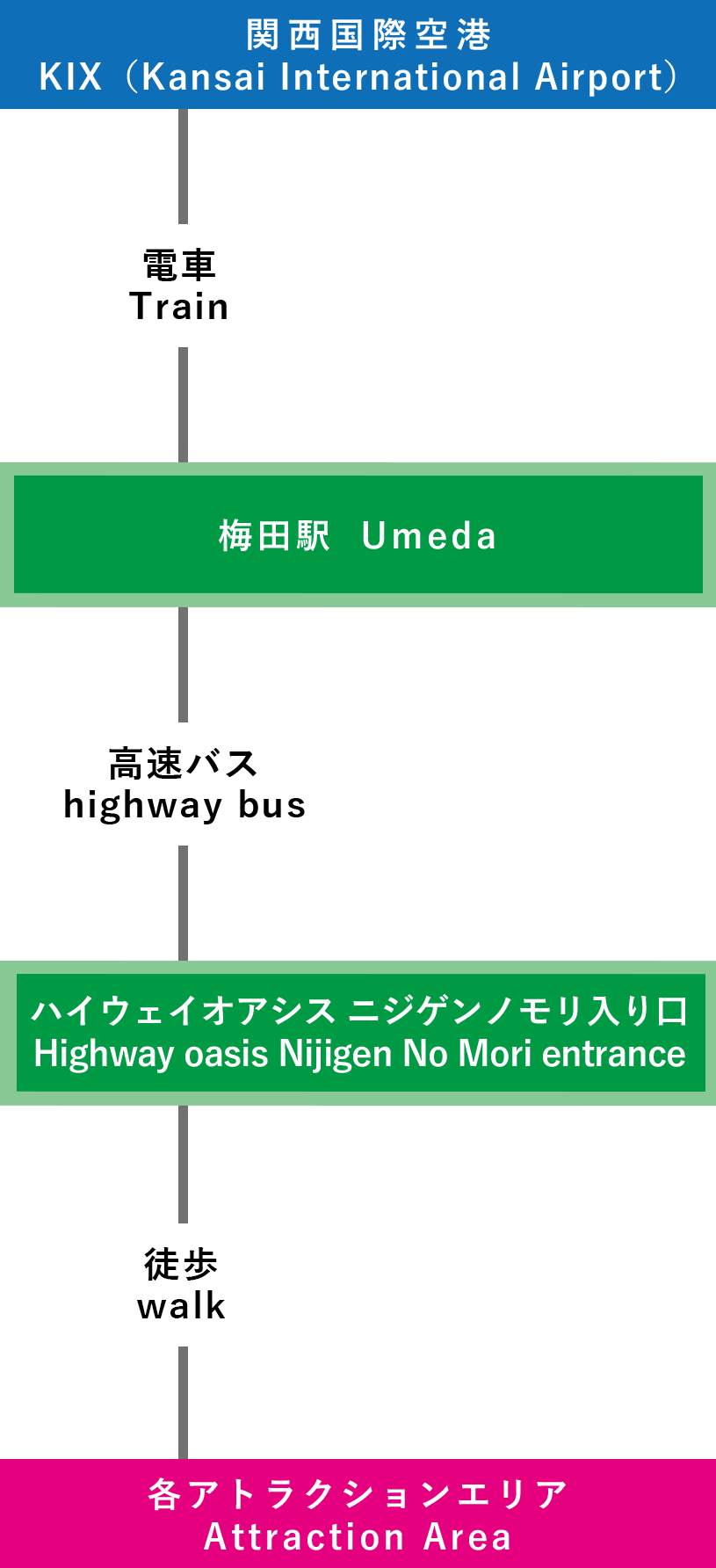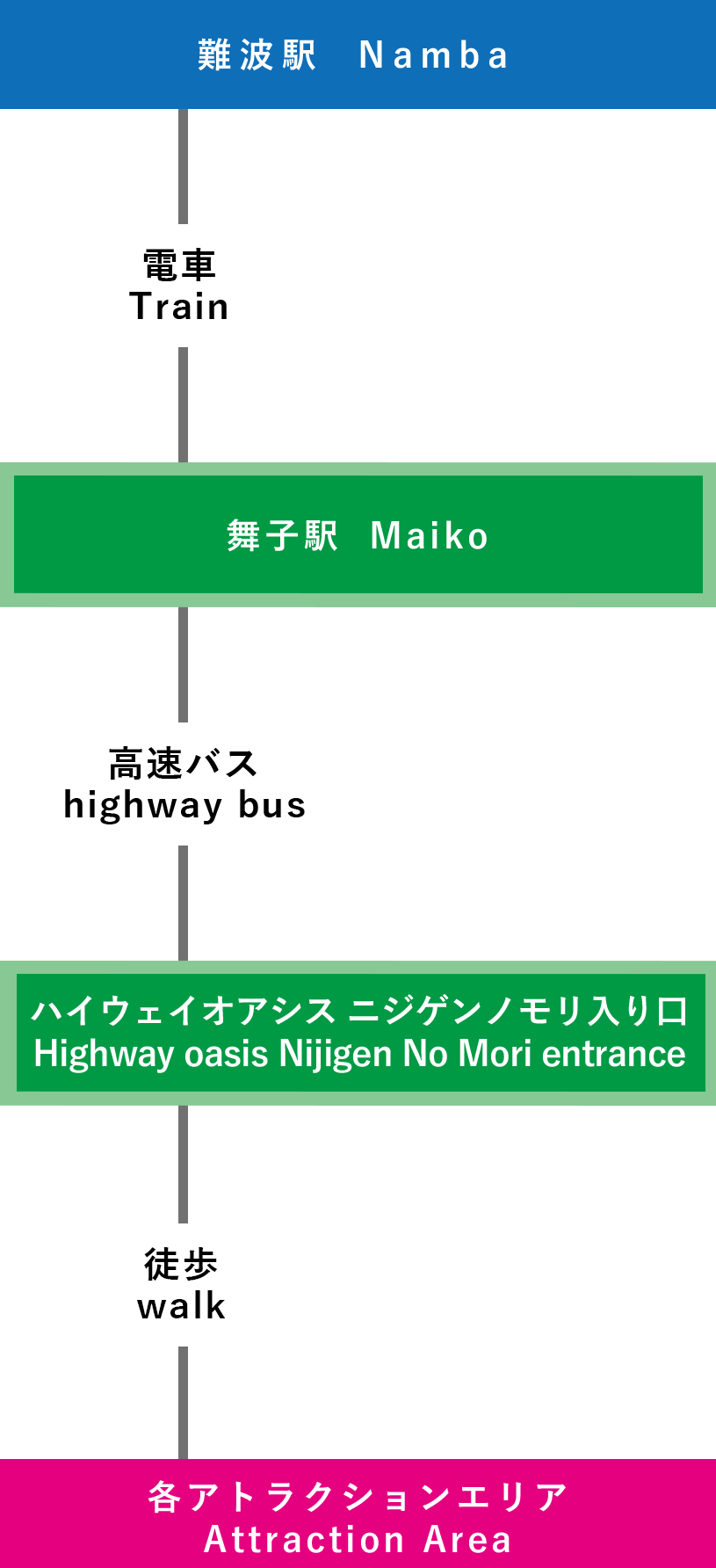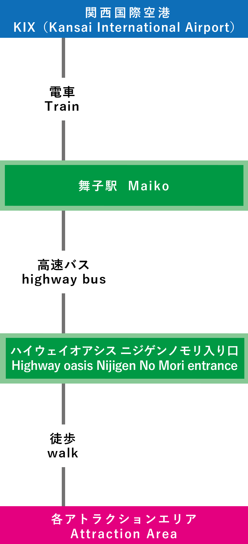 | 電車での行き方 【三宮(神戸)で乗り換え】 ⑦関西国際空港-三宮-淡路IC-ニジゲンノモリ(3時間15分~) |