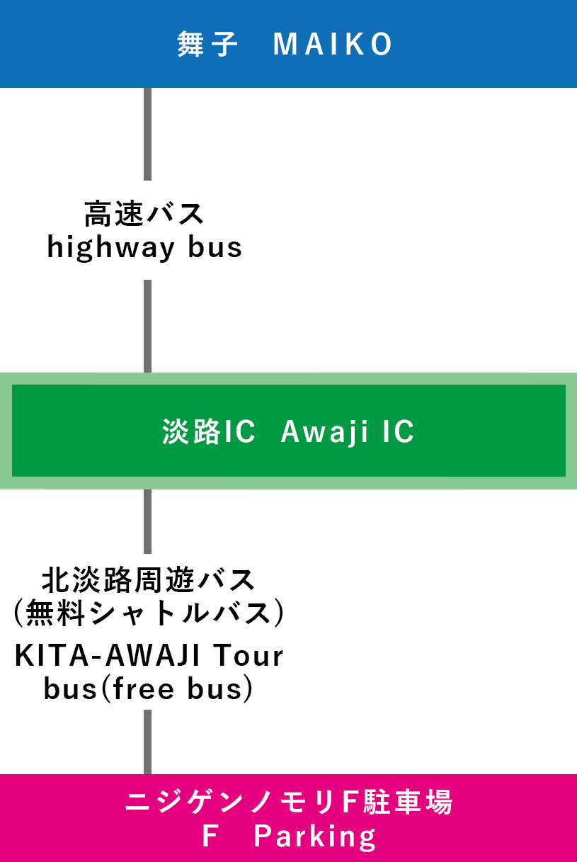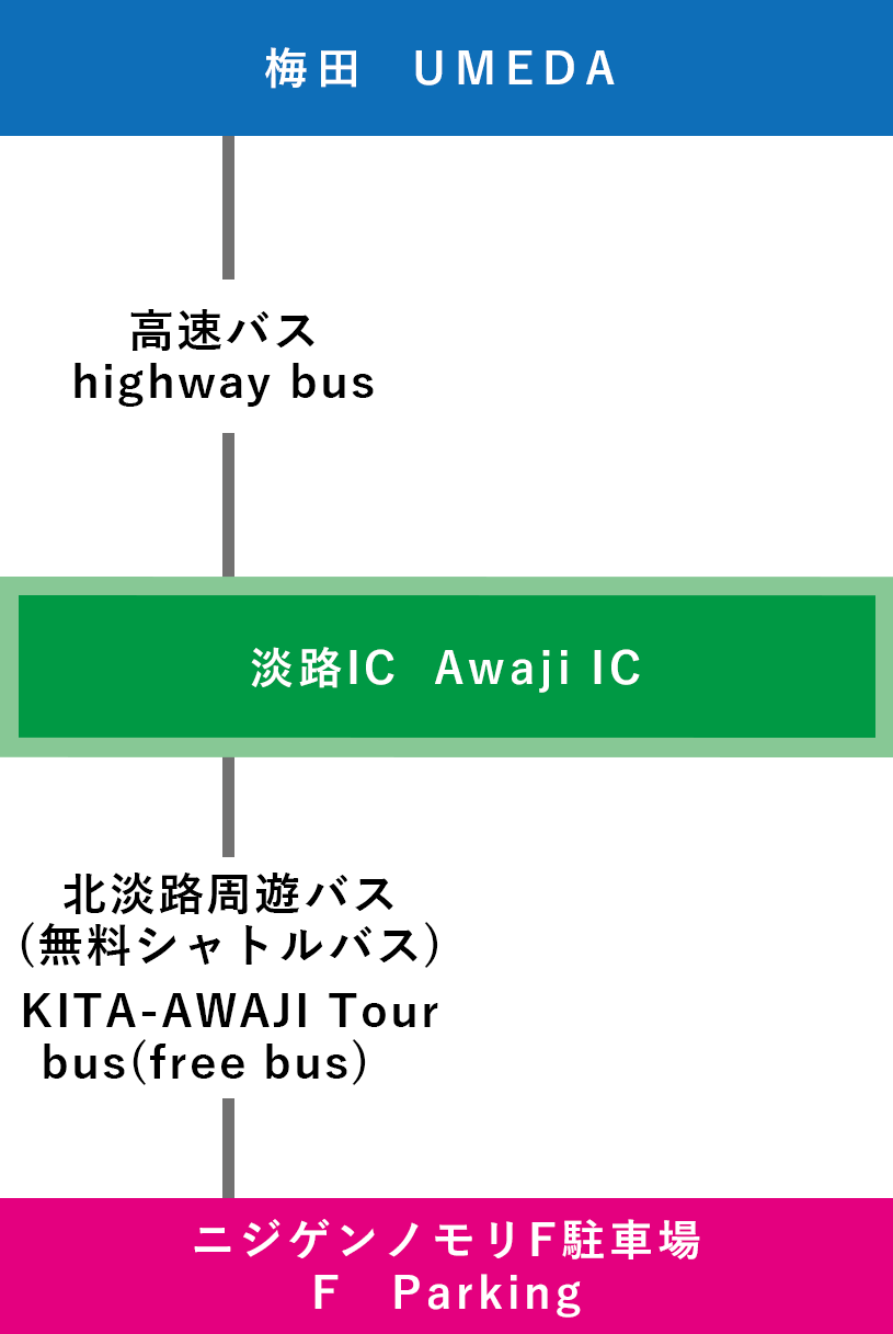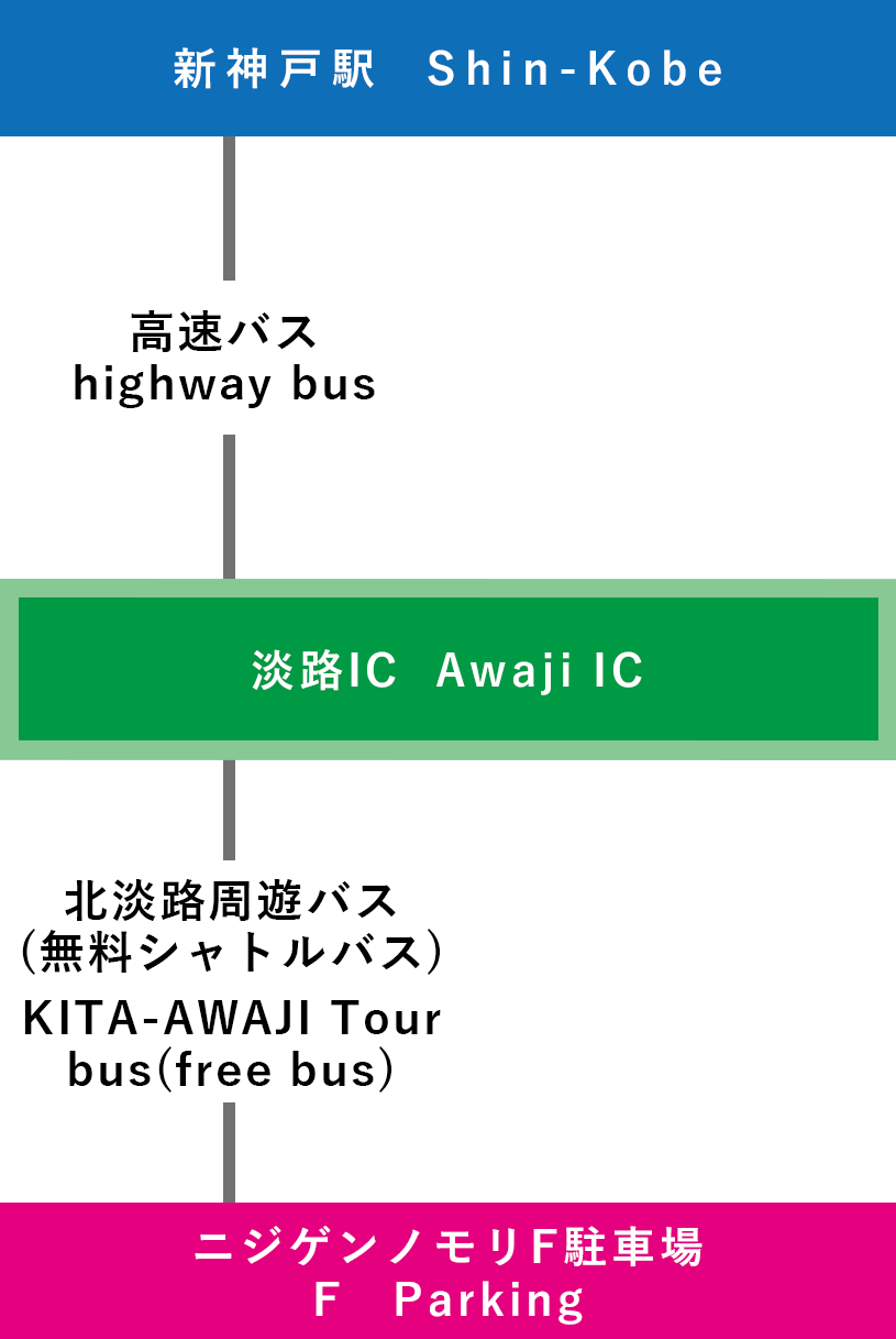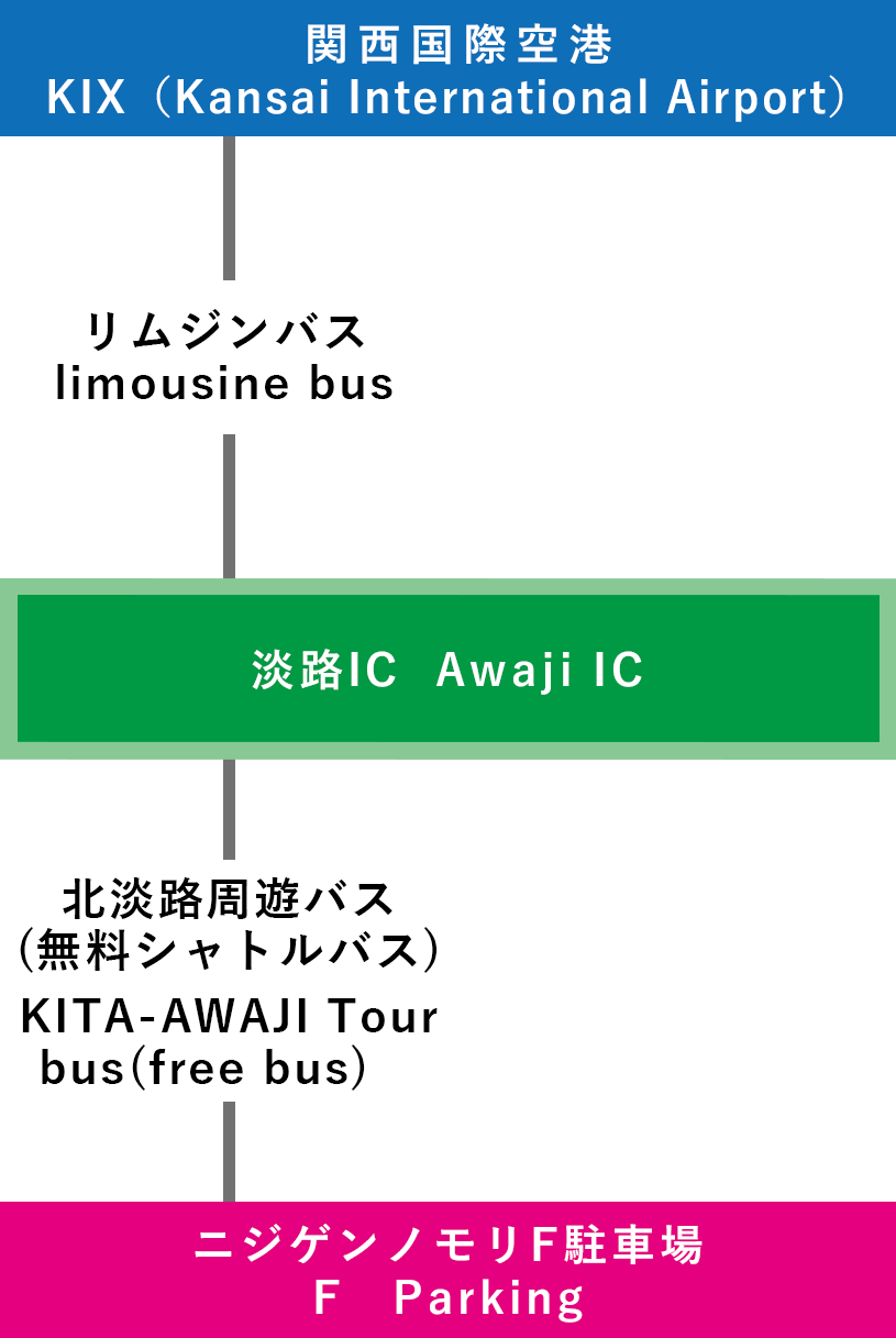 | 高速バスでの行き方 【淡路ICで乗り換え】 ①関西国際空港-淡路IC-ニジゲンノモリ(3時間~) ![]() |