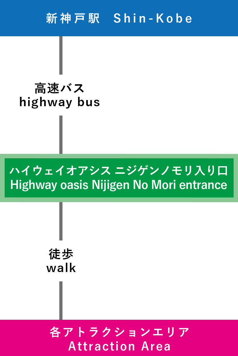 新神戸駅からの公共交通機関での移動時間は1時間~。高速バスでアクセスできます。1日2本往復運行するニジゲンノモリ直通便がおすすめ。