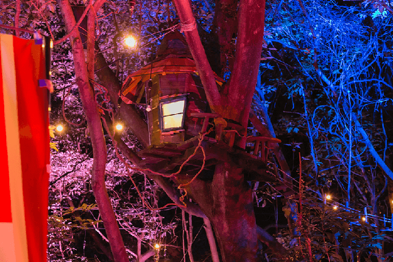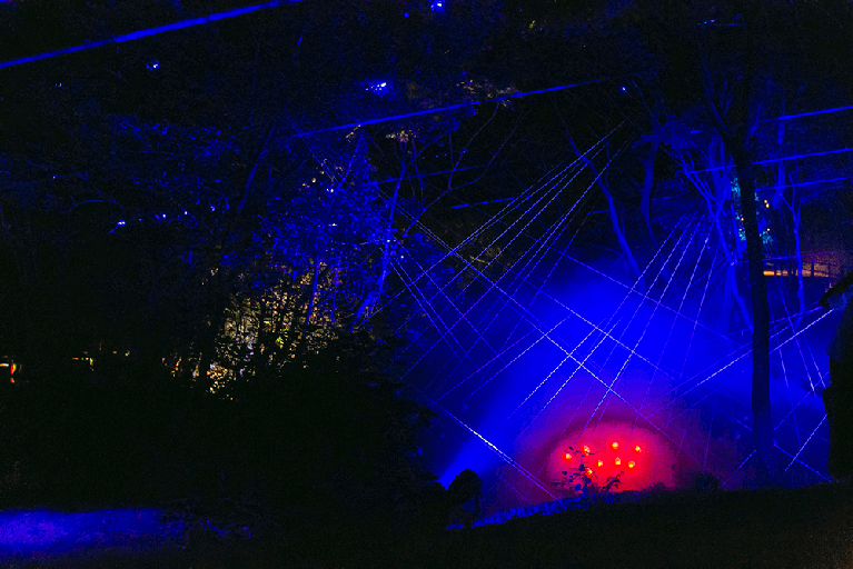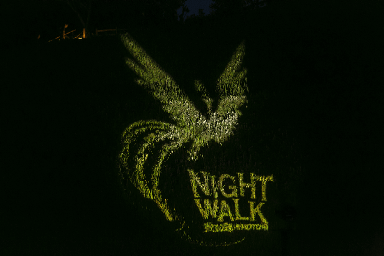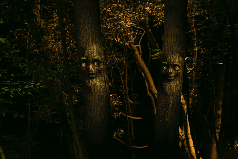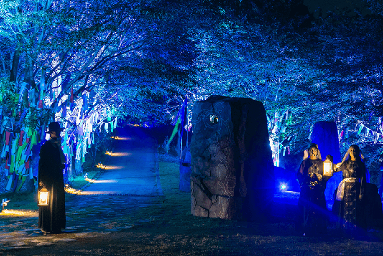 「ナイトウォーク 火の鳥」は、手塚治虫氏の「火の鳥」の世界感を題材にしたストーリーを追いながら、全長約1.2kmの暗い森の中を自らの足で歩いて体験するアトラクションです。